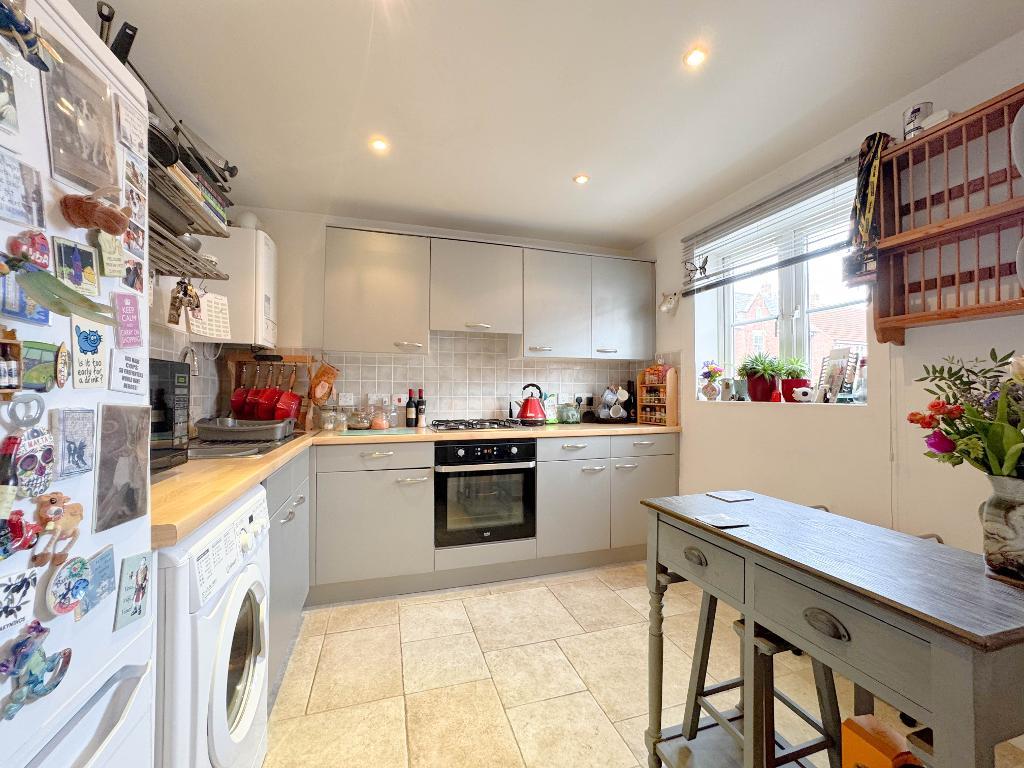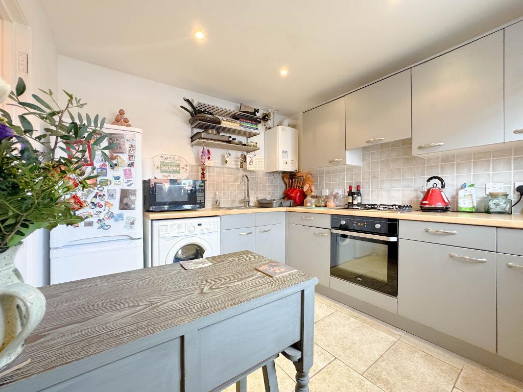 The property is set over three floors and provides flexible living space ideal for modern family life. On the ground floor there is a fitted kitchen with a good range of cupboard space, a beautiful stone tiled floor and plenty of workspace, along with room for appliances. To the rear is a generous living/dining room with ample space for both seating and a family dining table, creating a sociable and practical main living area with access out to the garden.