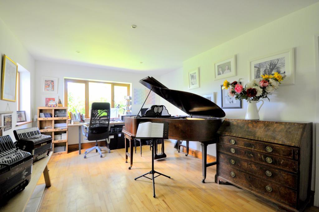 Through the the front door there is a light and spacious entrance hall providing access to the double aspect sitting room with stylish wood burner, double aspect music room / family room, fitted home office and cloakroom.